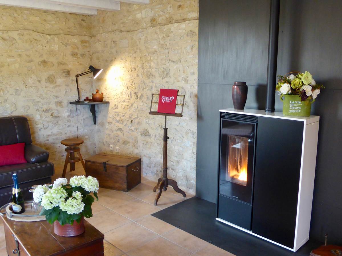 · Een grote zithoek met houtpelletkachel wacht op u voor gezellige avonden.